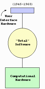 In her best-selling book PASSAGES, Gail Sheehy suggests that throughout our lives we all experience a series of predictable periods of psychological equilibrium punctuated by times of often traumatic transition. Sheehy emphasizes that while the experts have studied child development extensively, adult development has been largely ignored. To some extent, when we analyze the computer industry we suffer from the same preoccupation with dramatic, swift, and easily observable phenomena that induced leading psychologists to focus their attention on children. New products, new technologies, and new applications hold our interest until they become established fixtures in the industry landscape. Then, as we find them too diverse and too complex to classify, or too stable to hold our interest, we turn away from them and focus our attention on more exciting things. While it may be true that the child is father of the man, it is the adult who directs the course of civilization. Similarly, while wafer-scale integration, voice recognition, and artificial intelligence may presage the shape of future products, we still have much to learn from the many more mature products that form the basis of our industry. Let's step back then, not one step but many, and reexamine the basic relationship that has evolved between computer hardware and software since the mid-1940s. Charting this evolution will uncover some trends that tell us a great deal about the future of software architecture in interactive systems. The first stored program computers were designed by electrical engineers and mathematicians for whom the intricacies of hardware systems and binary arithmetic became an easily acquired second nature. The control programs for these systems were simply soft extensions of the hardware's logic. This software, written first in the language of the machine (codified binary notation) and later in an assembly language, exercised a very direct and hence primitive control over each of the computer's hardware components - card reader, drum storage, arithmetic and logic unit, and printer. The computers themselves were massive devices that performed one job at a time. Trained operators mounted magnetic tapes, loaded cards, and ultimately flipped banks of toggle switches to load programs and get things started. Once under way, the early-computer applications required little or no human intervention. User interface hardware, if we stretch our modern-day meaning of the term, consisted of card or punched paper tape readers, magnetic tape drives, and rows of switches and flashing lights. The relationships among the user interface hardware, the software, and the computational hardware are illustrated in Fig. 1.