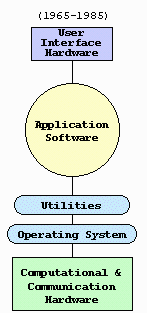 ![]() Figure 2: Stage II - The Application System/Operating System Dichotomy For obvious economic reasons, true software portability was not enthusiastically endorsed by the major hardware manufacturers. Instead, they concentrated on limited, vendor-specific versions of portability described by terms like "upward and downward compatibility." This allowed users to purchase ever more powerful machines without having to rewrite all of their programs, and yet it gave them a strong incentive to stay within the vendor's fold. Proprietary operating systems were the order of the day. Today the industry seems obsessed with two ideas: user friendliness and industry compatibility. Especially as most mini and micro systems become high-volume commodity products, vendors recognize that it is important to get customers to buy the product in the first place; the key to sales in today's market is application software. Worries about retaining customers are secondary - if you don't sell them in the first place, you needn't worry about keeping them. In previous years, most companies using computers found it relatively easy to make a central decision on which manufacturer's equipment to buy. The choice of manufacturers may not have been easy, but the need to make the decision centrally was clear. Computers were large, expensive, required extensive internal support, and ran a fairly limited, well-defined set of applications. Everyone knew what computers could do. They were employed as administrative support systems and every major vendor offered a standard set of application packages: personnel and payroll administration, accounts receivable and payable, customer records, and so on. Now the picture is changing as several distinct forces converge to radically redefine the role of computers in business and in society at large. Most significantly, computers are becoming