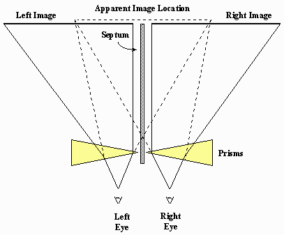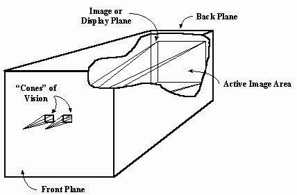 ![]() Fig. 4 Stereo Viewing Hood 3. 1 Continuous Depth Gradient Problem At this point it may be argued that the existence of single objects which are not parallel to the image plane is essential even to many of the most primitive three-dimensional compositions. If this be the case, which is debatable, it should be noted that it is possible to produce a certain subset of this class of objects, namely, those objects whose depth gradient is piecewise-linear at the boundary. Consider for example, the case of a cube being viewed at an angle from which only the top, the front, and the right side can be seen. If the front is parallel to the image plane, then the two visible sides must necessarily be perpendicular to it. These two surfaces can be precisely created by the following procedure: