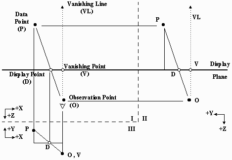 The first point is the most important for it represents a reaffirmation of the principal axiom of user-oriented system design. Consequently, although the mathematical expressions which describe the fundamental geometry of stereoscopy involve a plethora of independent variables point-of-view coordinates, interocular distance, orientation of the image plane, et cetera the implementation of those equations in the present system reduces the general case to the specific viewing structure illustrated in Fig. 3. Under this system the left and right points-of-view are fixed ((-5x, 0y, l00z) and (+5x, 0y, l00z), respectively), the interocular distance vector is, therefore, (10x, 0y, 0z), and the optic axes, when parallel to each other, are perpendicular to the image plane.